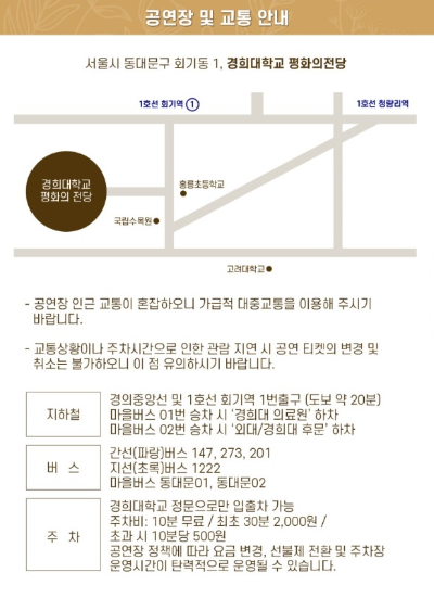공연장소는 서울시 동대문구 경희대로 26(경희대학교 평화의 전당)으로 아래 지도에서 확인하시기 바랍니다.